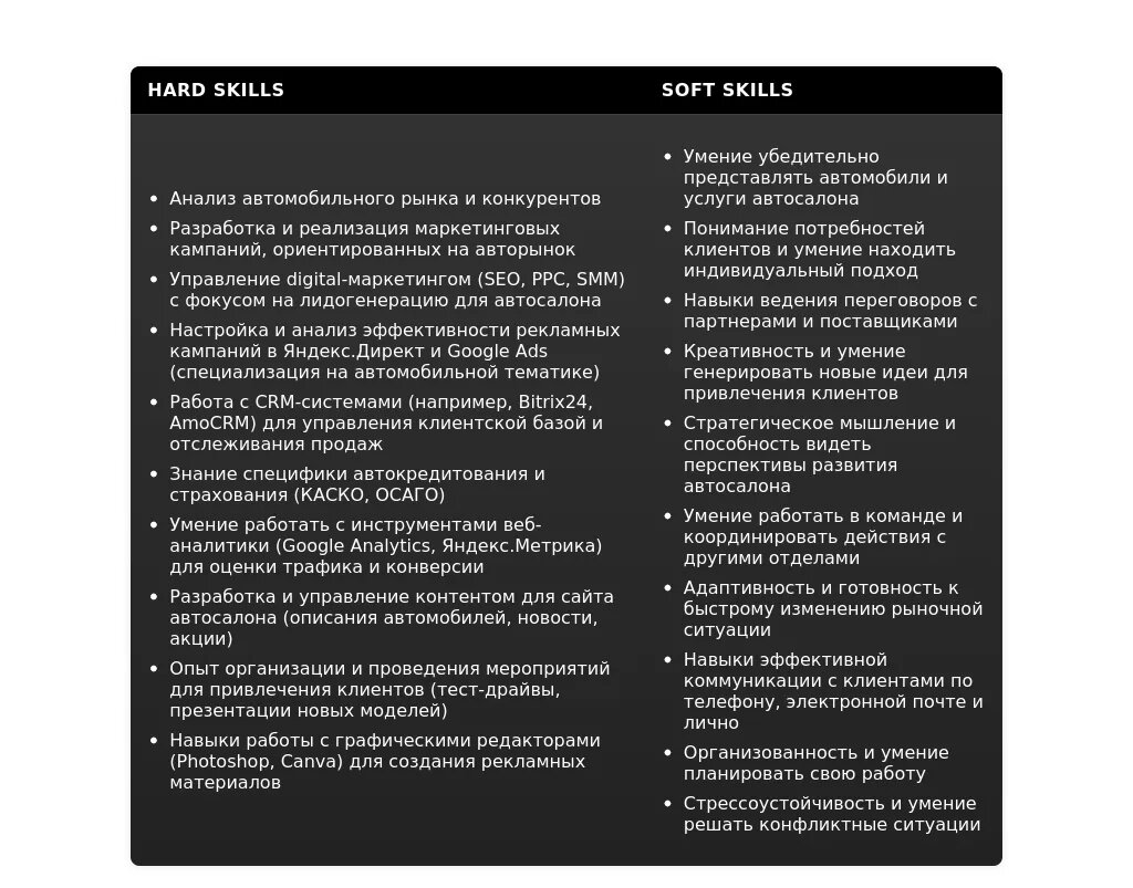 - На какие качества делать акцент: Креативность, аналитическое мышление, коммуникабельность, знание digital-маркетинга, интерес к автомобилям.