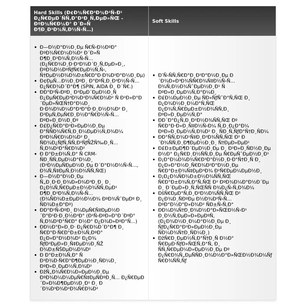 - Как выделиться среди других кандидатов: Подчеркните свои уникальные навыки и опыт. Например, знание иностранных языков, опыт работы с крупными клиентами, умение проводить презентации и тренинги.