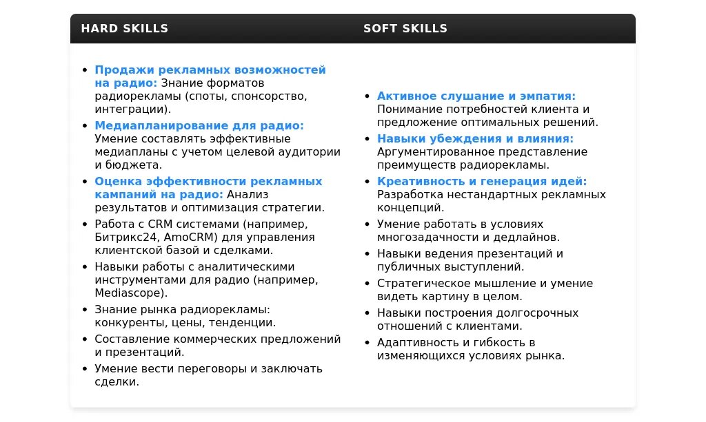"Навыки продаж: активный поиск и привлечение клиентов, ведение переговоров на любом уровне, заключение договоров, выполнение плановых показателей. Навыки работы с клиентами: развитие долгосрочных отношений с клиентами, консультирование клиентов по вопросам рекламы, разработка индивидуальных рекламных кампаний. Инструменты: CRM (продвинутый уровень), MS Office (продвинутый уровень)."