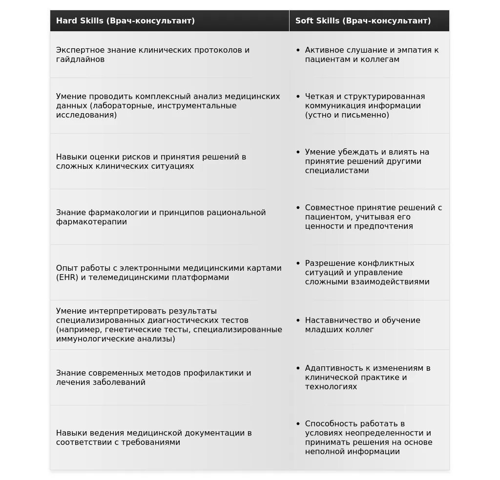 - Ошибка 2: Перечисление навыков без контекста. "Отличные коммуникативные навыки, знание английского языка, уверенный пользователь ПК". Непонятно, как эти навыки применимы к работе врача-консультанта.