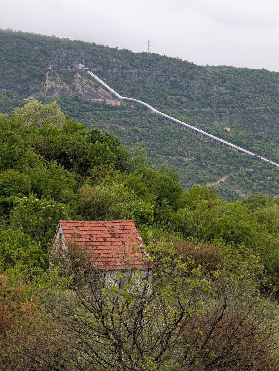 Черногория. 26.04.2025 Вершина горы помечена белым крестом. Так в Черногории принято отмечать святые места, чтобы их хорошо было видно издали. Вид снизу. Если присмотреться и очень сильно приблизить, то видно монастырь. А над ним крест.