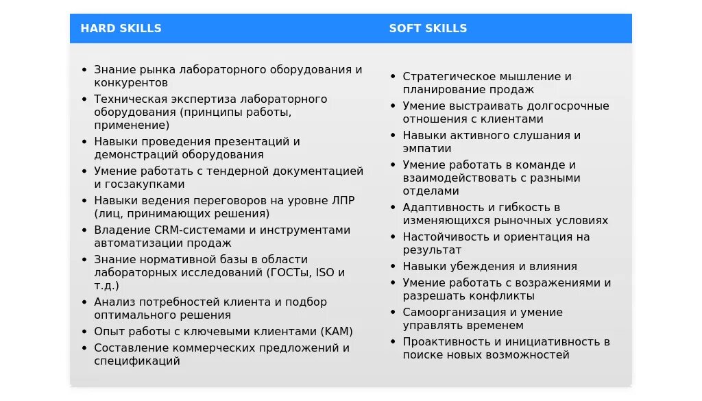 Выделите ключевые компетенции, которые требуются для выполнения работы. Например, "знание техник продаж", "умение проводить презентации", "навыки работы с CRM", "опыт работы с лабораторным оборудованием".