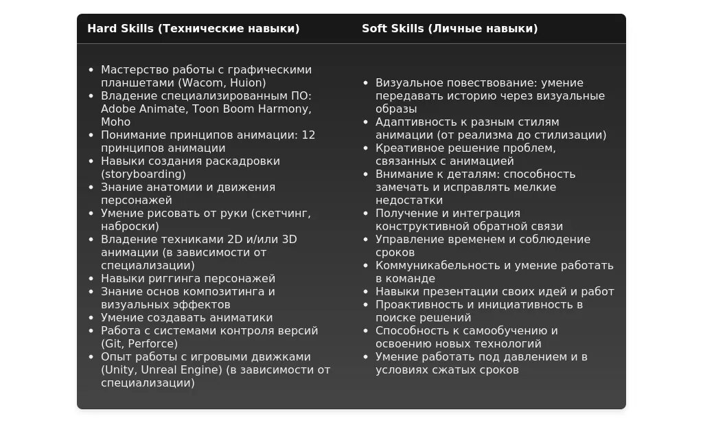 - Владение программами (например, Adobe Animate, Toon Boom Harmony).