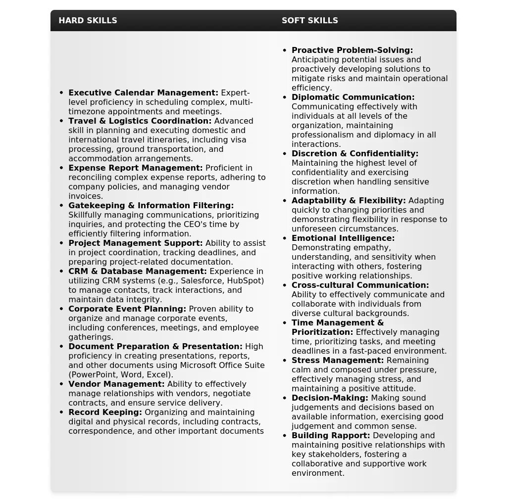 - Оптимизация под ключевые слова: Используйте ключевые слова, которые часто встречаются в описаниях вакансий Personal Assistant to CEO.