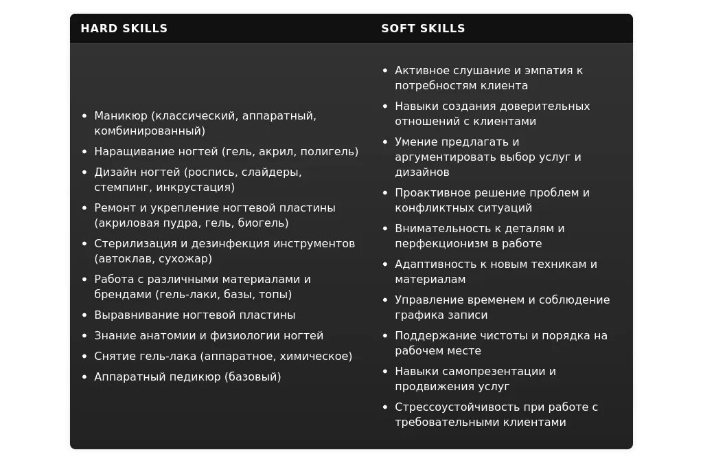 Навыки дизайна: Создание сложных дизайнов (роспись, стемпинг, слайдеры), работа с разными материалами (гель-лаки, акриловые пудры, блестки). Коммуникативные навыки: Консультирование клиентов по выбору дизайна, индивидуальный подход к каждому клиенту, умение разрешать конфликтные ситуации.