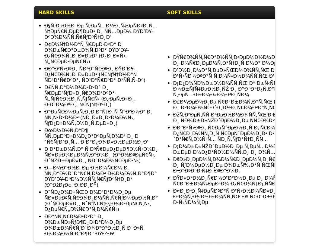 Используйте ключевые слова из вакансии в разделе "Навыки". Это поможет вашему резюме пройти через систему отбора резюме (ATS) и привлечь внимание работодателя.