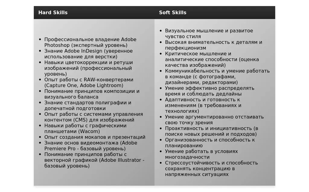 - Основные навыки: Выделите основные навыки, необходимые для выполнения работы бильд-редактором (например, знание графических редакторов, опыт работы с фотостоками).