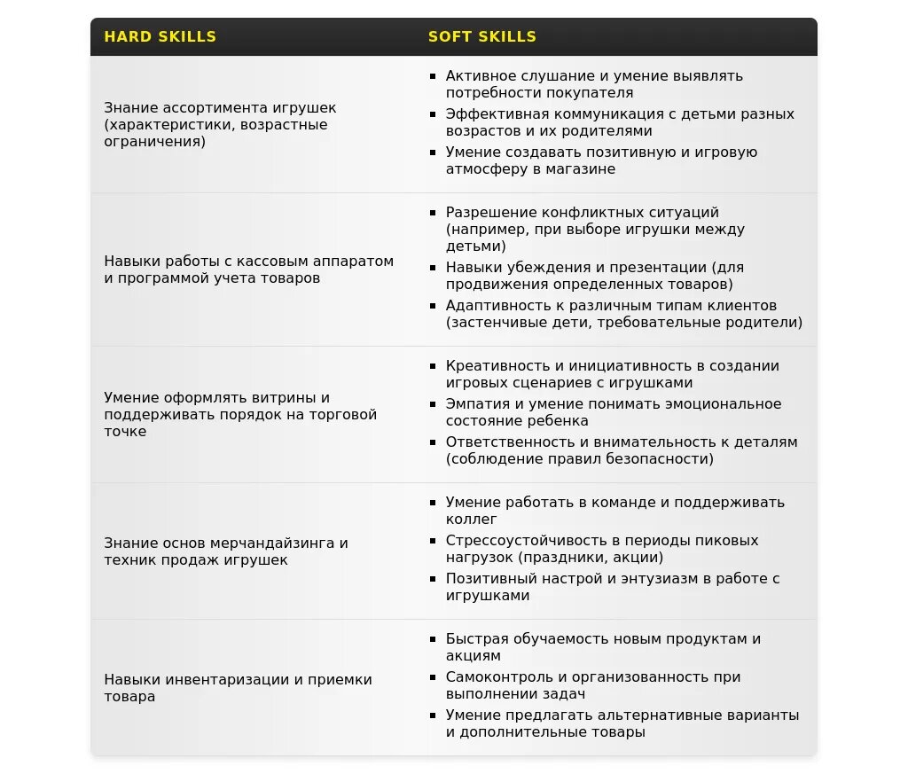 - Несоответствие вакансии: Упор на навыки, нерелевантные для позиции продавца игрушек.