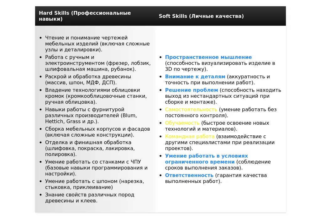 - Столяр-сборщик: "сборка мебели на заказ", "работа с ручным инструментом", "подгонка деталей", "обеспечение высокого качества сборки", "минимизация брака".