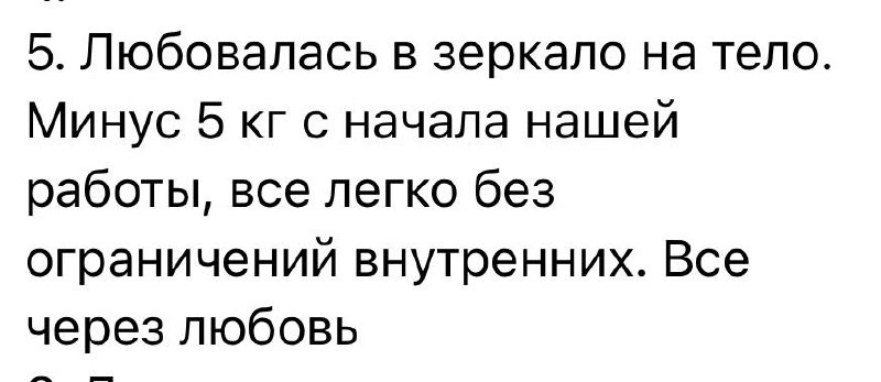 Давайте порадуемся вместе с прекрасной женщиной ⚡️🙏🏻 новый результат пришел, кайффф Да, дорогие, не во всех случаях, но во многих ВЕС - лишь ваш щит 🛡️ Ваша защита, ваша броня меняя мышление, отношение к себе, к миру, к мужчинам часть веса САМА уходит вообще наше тело - как структурный пластилин. Для того, чтобы из него слепить желаемую форму, нам нужно сначала его согреть в руках любви, когда оно станет расслабленным и мягким, можно лепить 😁 Жизнь проще, чем вы думаете 🥰 Жду в 5 поток ПРОГРАММЫ «В КОНТАКТЕ С СОБОЙ» всех женщин, кто хочет жить ЛЕГЧЕ и ЛУЧШЕ, чем сейчас