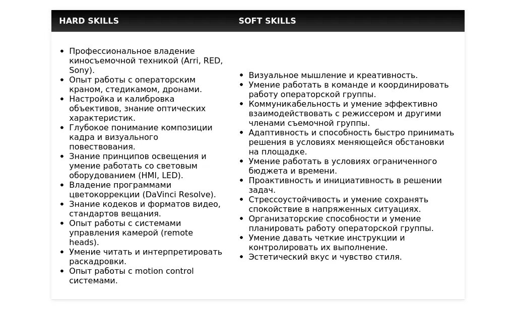 Используйте ключевые слова из описания вакансии при перечислении своих навыков. Например, если в вакансии указано "опыт работы с камерами ARRI", обязательно укажите этот навык в своем резюме.