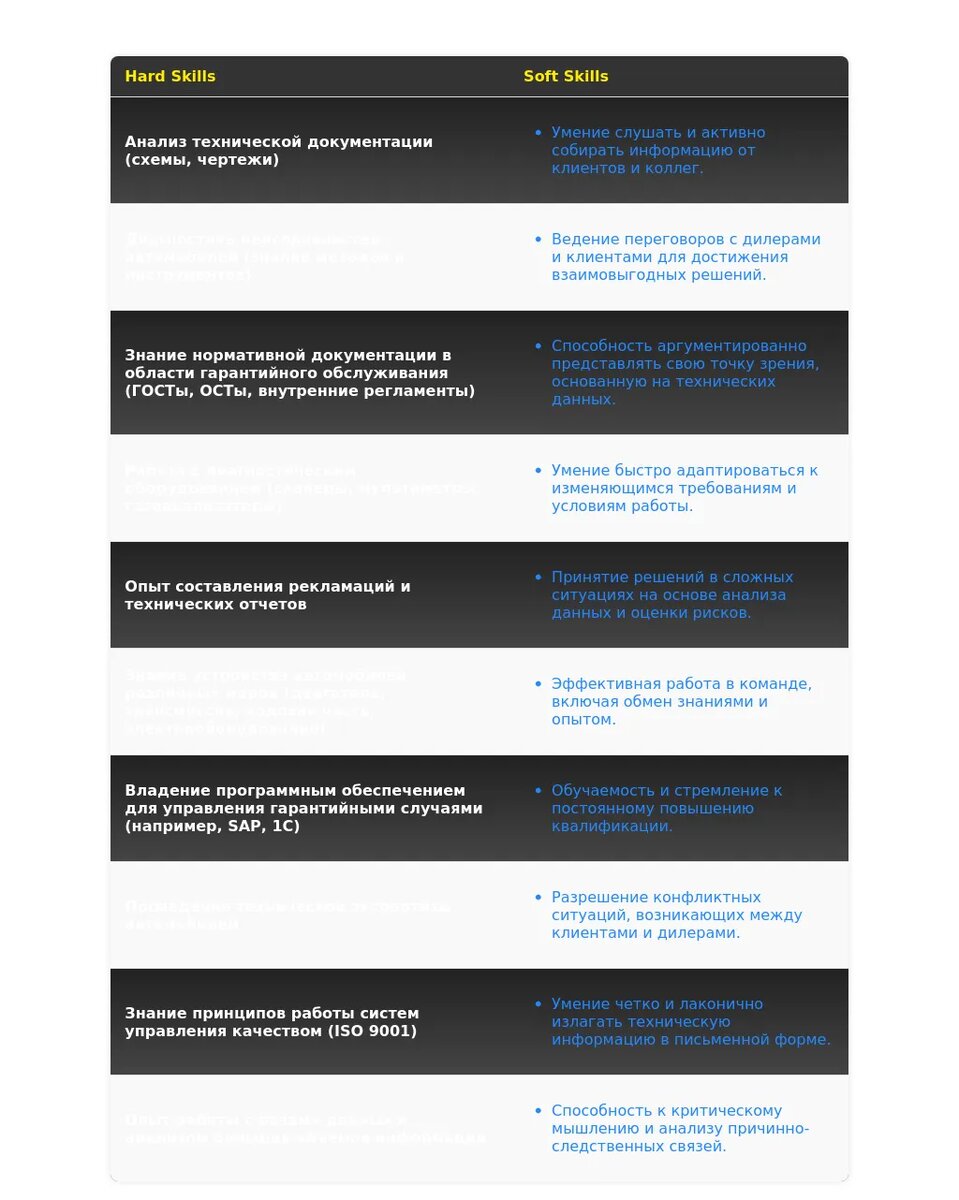 - Ведущий инженер: "управление гарантийным отделом", "разработка гарантийной политики", "рассмотрение сложных гарантийных случаев", "взаимодействие с дилерской сетью", "опыт управления персоналом", "знание гарантийного законодательства".