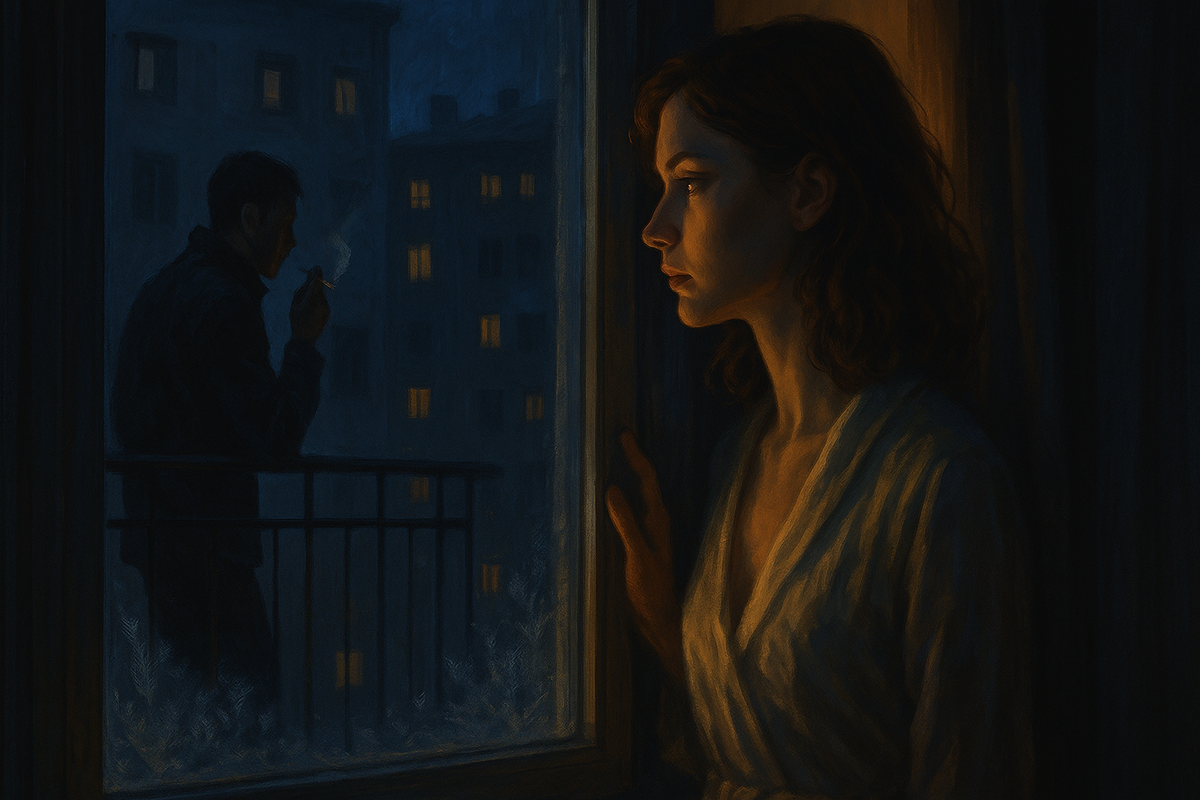 Когда Марина впервые увидела его, она даже не поняла, что именно её зацепило. Возможно, лёгкая сутулость — как будто он несёт на плечах что-то тяжёлое, невидимое. Или то, как он курил: медленно, затягиваясь, будто вдыхал воспоминания, а не табак. Он стоял на балконе дома напротив, прямо напротив её окна. Она заметила его в январе. Зима выдалась холодной, стекла покрывались тонким узором инея, но Марина каждый вечер отодвигала занавески и смотрела. Он выходил на балкон в одно и то же время — в 22:13. Ни минутой раньше. Ни позже. Стоял в тёмной куртке, не подходя к перилам, и смотрел… на её окно. Сначала она пыталась не придавать этому значения. Сосед, курит, что с того? Но с каждым вечером росло ощущение, что он не просто смотрит в сторону, а в неё. И чем больше она пыталась отмахнуться, тем сильнее цепляло это молчаливое внимание. Муж — Алексей — поздно возвращался с работы, уставший, холодный, чужой. Они давно уже спали в разных комнатах, не ругались, но и не жили — просто сосуществов