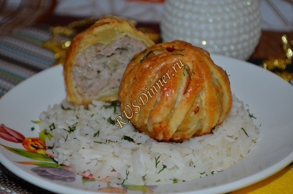 Мясные шарики в слоеном тесте Ингредиенты: Свинина - 600 гр. Лук репчатый - 1 шт. (большая) Соль - 5 гр. Перец черный молотый - 3 гр. Приправа для жарки мяса - 3 гр. Чеснок - 3 зуб. Тесто слоеное без дрожжевое - 500 гр. Мука - 100 гр. Яйцо - 1 шт. Источник: https://rusdinner.ru/page/mjasnye-shariki-v-sloenom-teste
