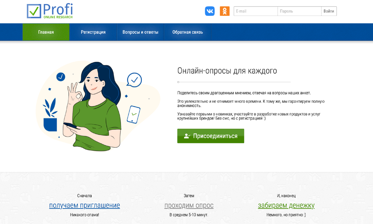 Один из самых простых вариантов удаленной работы — это прохождение платных опросов. Например, на платформе Profi Online Research.