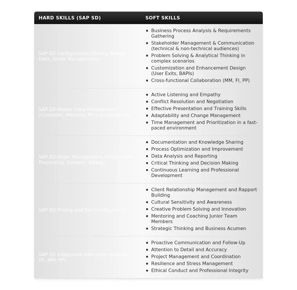 - На какие качества и навыки делать акцент: Аналитическое мышление, умение решать проблемы, знание основ бизнес-процессов, понимание архитектуры SAP.