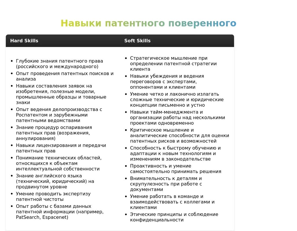 - Опишите свои уникальные навыки и опыт, которые отличают вас от других патентных поверенных.