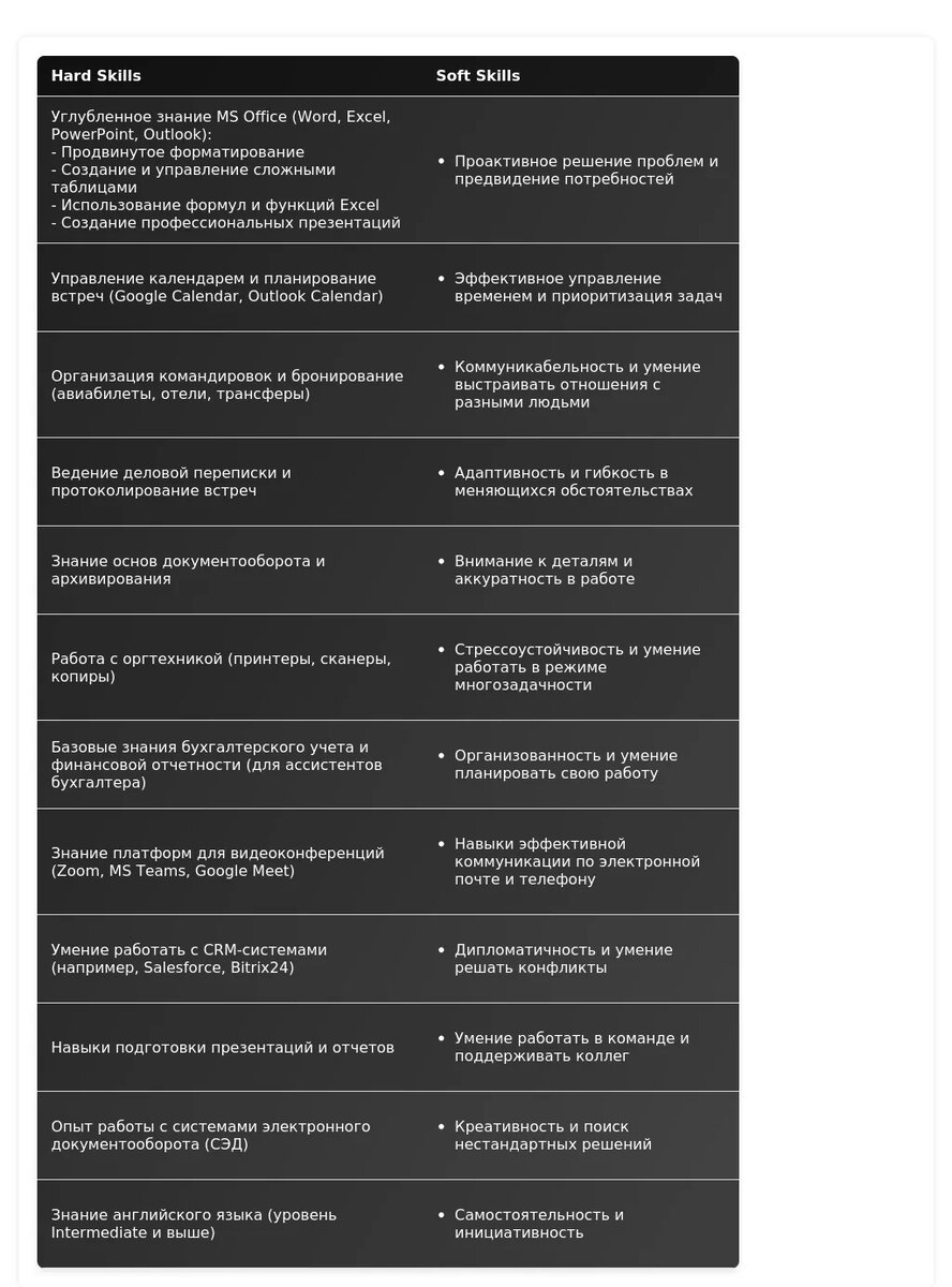 "*Технические навыки:* MS Office (продвинутый пользователь), Google Workspace (опытный пользователь), *CRM-системы (базовые знания)*, работа с оргтехникой. *Организационные навыки:* ведение документооборота, организация встреч и конференций, *поддержка IT-проектов.*"