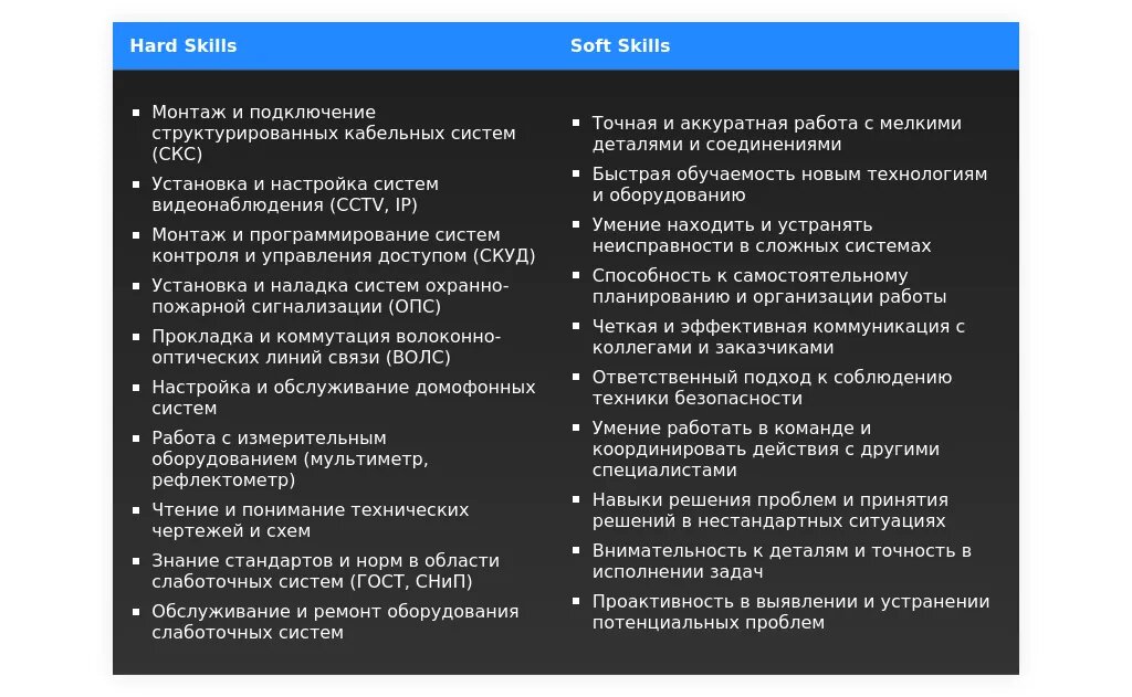 - На какие качества и навыки делать акцент: Ответственность, внимательность к деталям, обучаемость, умение работать в команде, знание основ электротехники и принципов работы слаботочных систем.