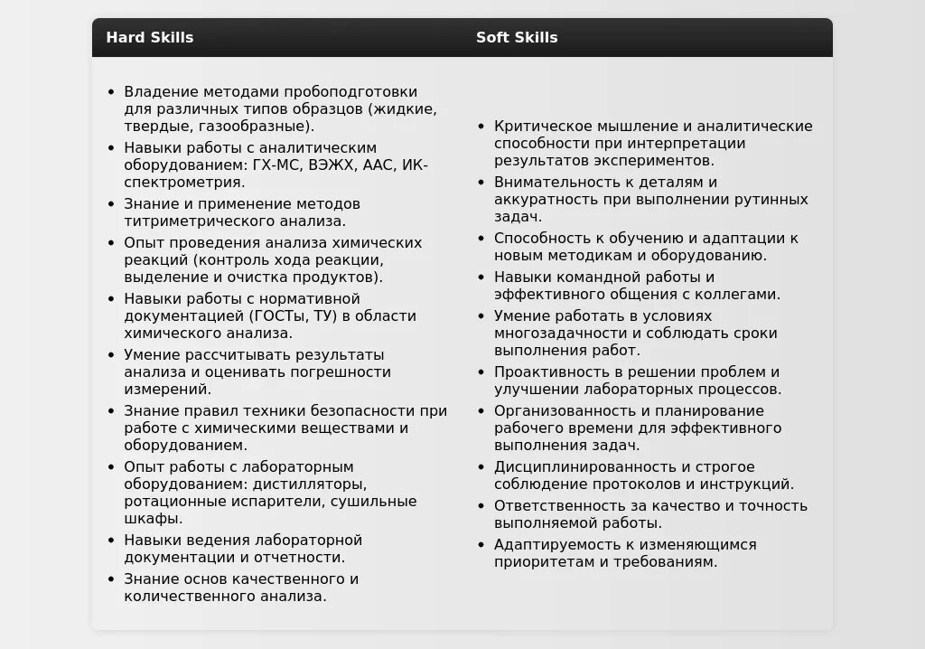 Ключевые навыки и компетенции, релевантные для позиции химика-лаборанта.