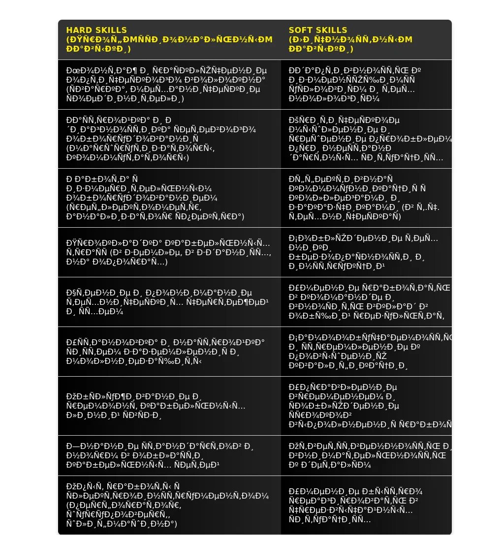 Почему это плохо: Хотя это может показаться всеобъемлющим, это может вызвать сомнения в вашей экспертизе в конкретной области. Лучше сосредоточиться на конкретных навыках и специализациях.