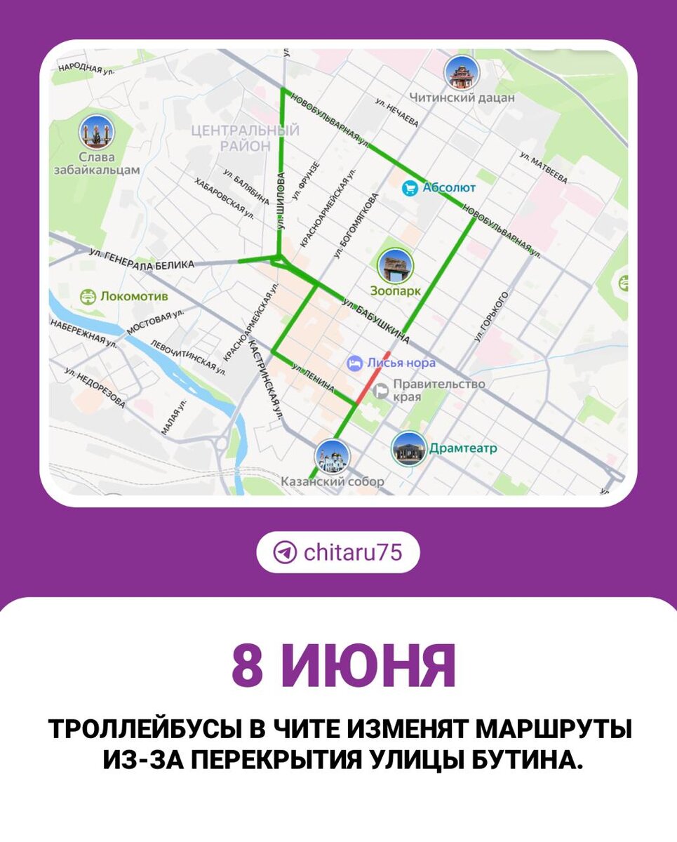 8 июня с 16:00 до 18:00 движение на участке от Чкалова до Ленина будет временно закрыто из-за XII Забайкальского международного кинофестиваля. Троллейбусы №1 пойдут через Новобульварную, Шилова, Бабушкина, Богомягкова и Ленина, а №2 — по Генерала Белика и Бабушкина. 🟦 Подписаться | Предложить новость