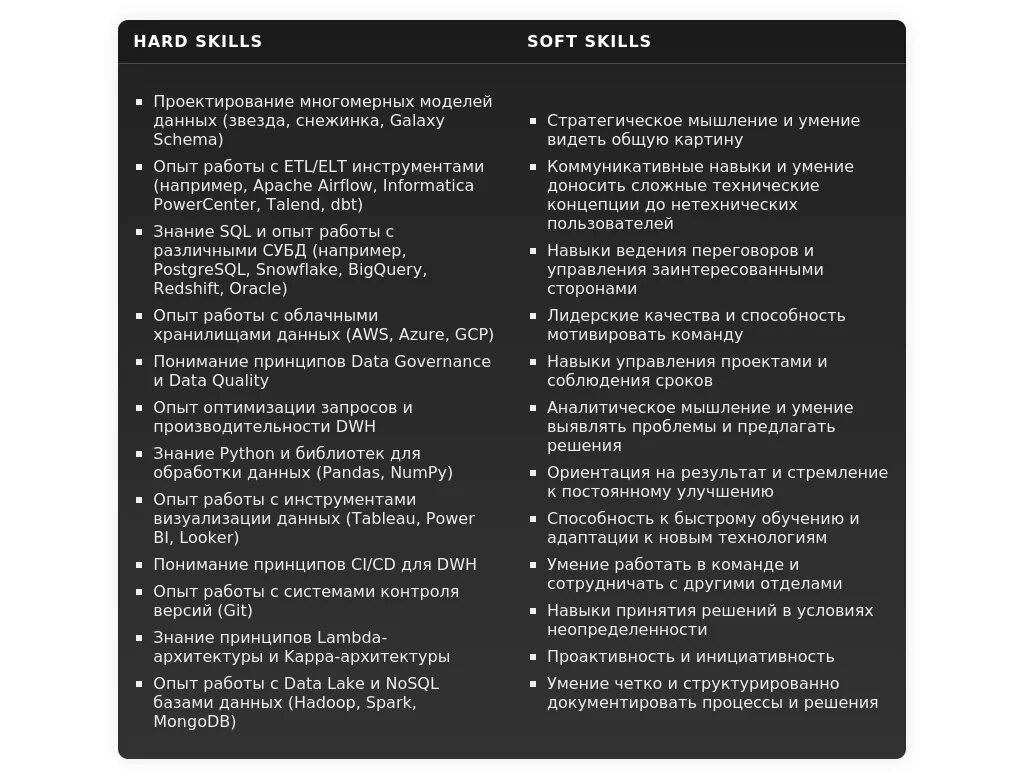 - Работа с облачными платформами: "Опыт работы с AWS, Azure, GCP", "Опыт работы с Snowflake, BigQuery, Redshift", "Опыт построения облачных хранилищ данных".