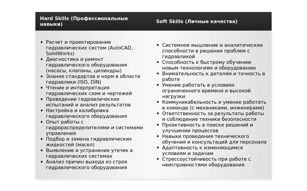 - Ошибка: Перечисление навыков без привязки к опыту. Пример: "Знание гидравлики, пневматики, AutoCAD." Как исправить: "Свободно владею AutoCAD и SolidWorks, применяю их для разработки гидравлических схем и 3D-моделей оборудования. Успешно использовал знания пневматики для оптимизации работы пневмосистем на предприятии."