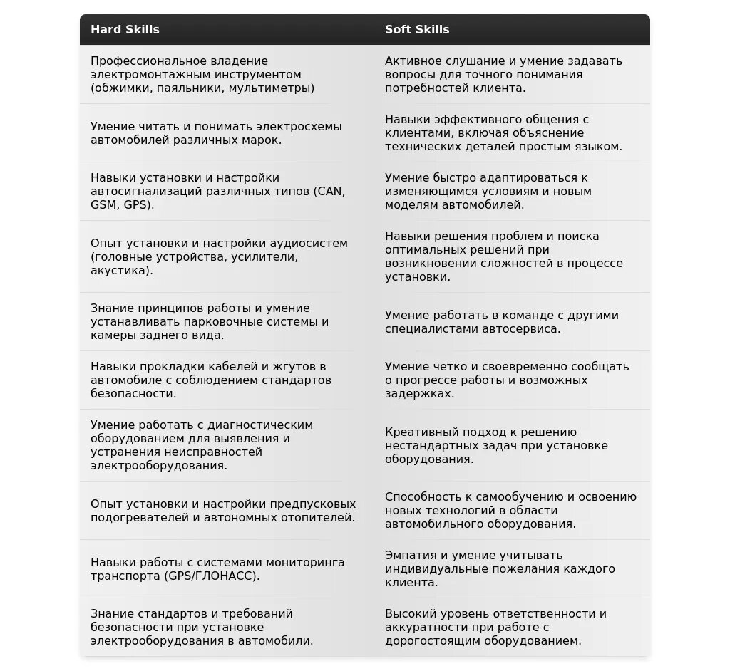 Ключевые навыки и умения, релевантные вакансии (например, установка сигнализаций, аудиосистем, парктроников).