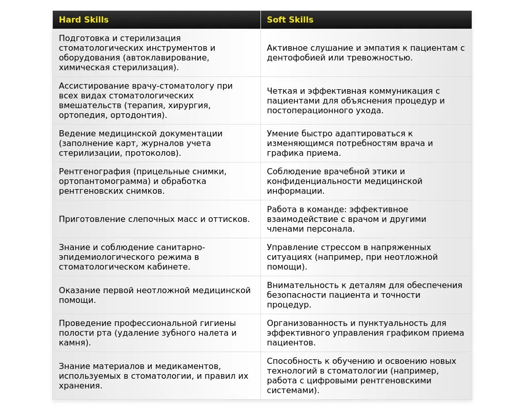 - Для вакансии ассистента стоматолога-хирурга: "Ассистирование при хирургических операциях", "Подготовка хирургического инструментария", "Обработка и стерилизация инструментов", "Соблюдение правил асептики и антисептики".