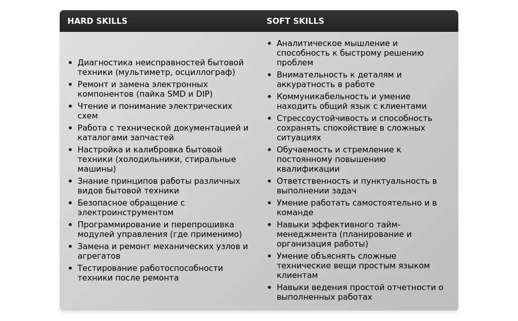 До: "Навыки: Ремонт бытовой техники, общение с клиентами, ответственность."