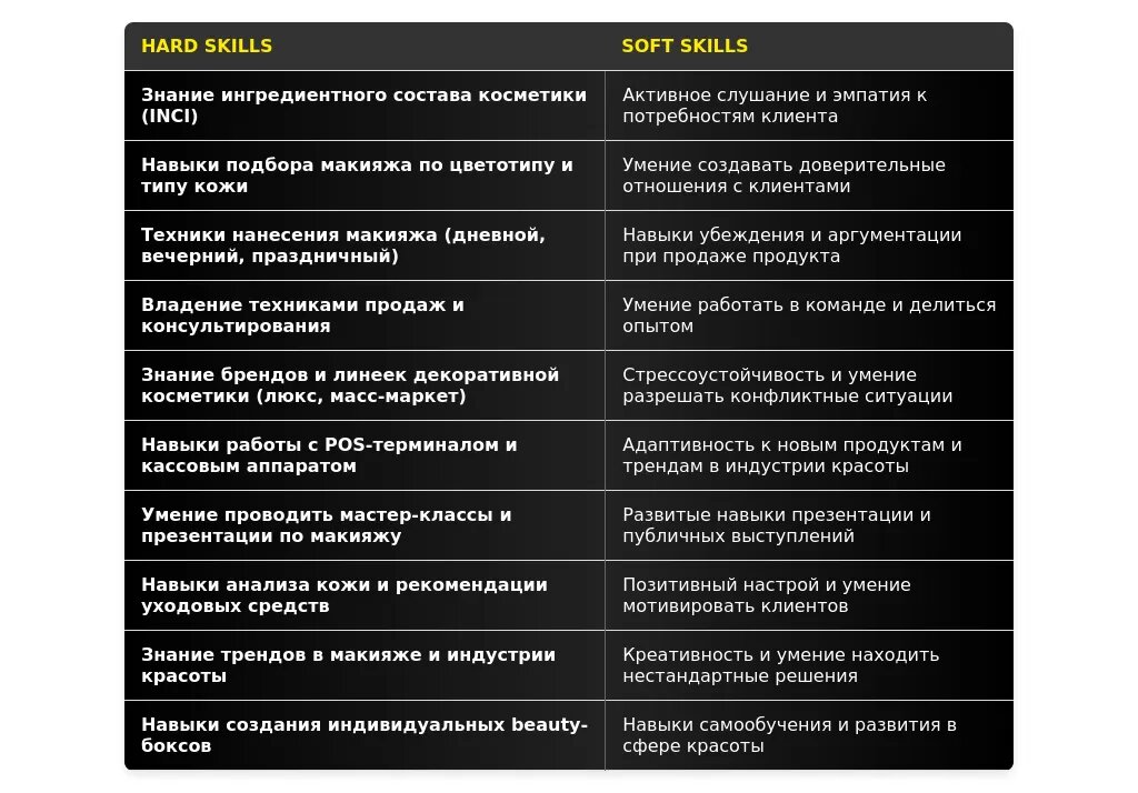 - Навыки работы с клиентами: Консультирование клиентов, выявление потребностей, подбор косметики, работа с возражениями.