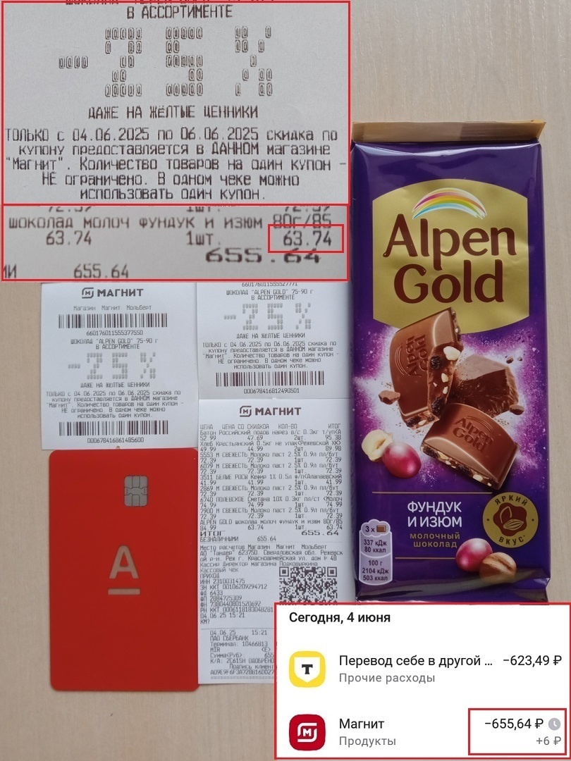 В то время, когда во всех ведущих российских банках снижается количество заманчивых предложений, а ставки по вкладам и накопилочкам падают; Красный Банк с большой литерой А на карте продолжает радовать своих клиентов!❤️ Так, сегодня в «Магните» я купила шоколад со скидкой 25%. Взяла ещё пару купончиков, чтоб завтра снова такие плиточки по акции купить. Стоимость - 63,74 ₽. Если учитывать, что уже и в «Чижике» Alpen Gold по 84 ₽ (буквально за пару выходных +22% к прошлой цене 69 ₽)... Цена шоколадки в «Магните» выгодная. К тому же 1% кешбэка вернулся с картой Альфы. Немного, конечно. Но ещё сегодня оплатила подписку «Магнит Плюс Премиум» со 100%-ным кешбэком. Такое предложение только в Альфе и действует до конца июня. Вчера получила 300 ₽ за отзыв. Стандартно спрашиваю об изменениях на вкладах и накопилочках, но максимально вежливо и заинтересованно!))) Банк меня поощряет, практически компенсировал мне поездку до ЕКБ... Банк предлагает покрутить барабан Альфа-Пятницы и испытать удачу от