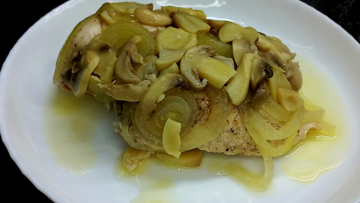 - филе куриное 1 шт. - маринованные шампиньоны 100 гр. - лук 1 шт. - соль, перец - масло сливочное 30 гр. ПРИГОТОВЛЕНИЕ: Филе куриное натереть солью и черным молотым перцем с двух сторон. Выложить на пергаментную бумагу. Луковицу нарезать кольцами, уложить на филе. Открыть банку с маринованными шампиньонами, слить рассол. Шампиньоны тонко нарезать и выложить на лук. Сверху положить кусочки сливочного масла. Завернуть в бумагу, затем в фольгу. уложить на противень. Запекать в разогретой до 200 градусов духовке примерно 30-35 минут. Выложить готовое филе на тарелку, полить соком Подписывайтесь на мой телеграмм канал с видеорецептами