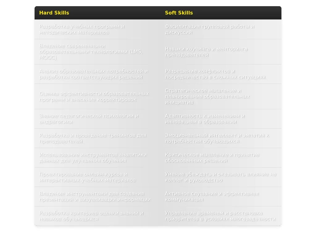 - Навыки: Перечислите навыки, которые вы приобрели во время учебы или стажировок (например, разработка учебных материалов, проведение тренингов, анализ эффективности обучения).