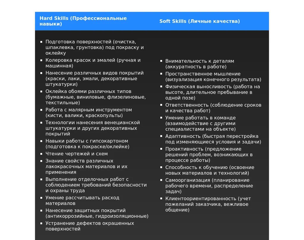 "Навыки: Работа с декоративными штукатурками (венецианская, фактурная), знание современных техник покраски, создание эксклюзивных отделочных покрытий, креативность, художественный вкус."