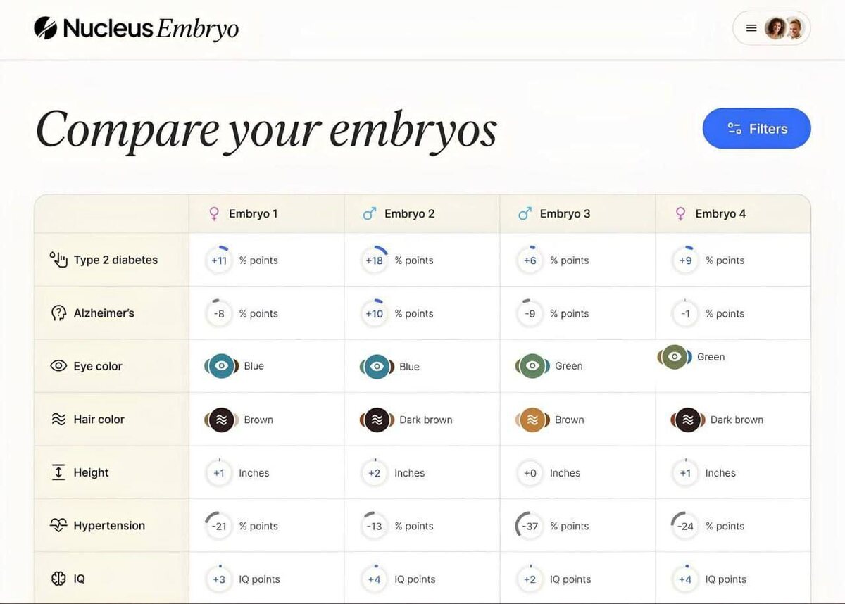 Американский стартап Nucleus предлагает парам перед ЭКО узнать все об эмбрионе: пол, рост, цвет глаз, волос, IQ, склонность к диабету