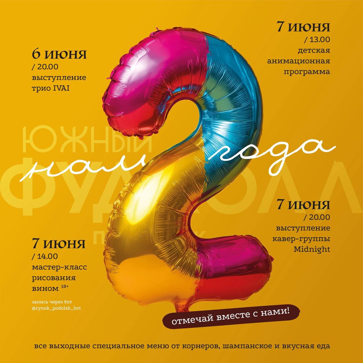 ✨ Двухлетие Фудхолла Южный! 🎉 🪩Готовьтесь к уикенду, полному вкуса, музыки и отличного настроения! Программа: 🗓️ 6 июня 🎶 20:00 — Головокружительное выступление трио IVAI — для ценителей живой музыки! 🗓️ 7 июня 🎨 14:00 — Мастер-класс рисования вином (18+) — творите, вдохновляйтесь. 🤖 Запись через бота: @rynok_podolsk_bot 👧 13:00 — Детская анимационная программа — игры, конкурсы и море радости! 🎤 20:00 — Зажигательное шоу кавер-группы Midnight — танцы до упаду и хиты, которые знают все! 🍽️ Все выходные: — Специальное праздничное меню — Игристое шампанское🍾 и вкуснейшая еда🍔🍕 Мы в ВК https://vk.com/rynok_podolsk и Телеграмм https://t.me/rynok_podolsk 🏢 Фудхолл Южный 📍 г. Подольск, ул. Академика Доллежаля, 39 ⭐Разместить публикацию ⭐Поддержать канал голосом ✅ Мероприятия Подольск https://dzen.ru/id/66ed500f7b5671493eca3fd6 http://vk.com/podolsk_events http://dzen.ru/podolsk_events