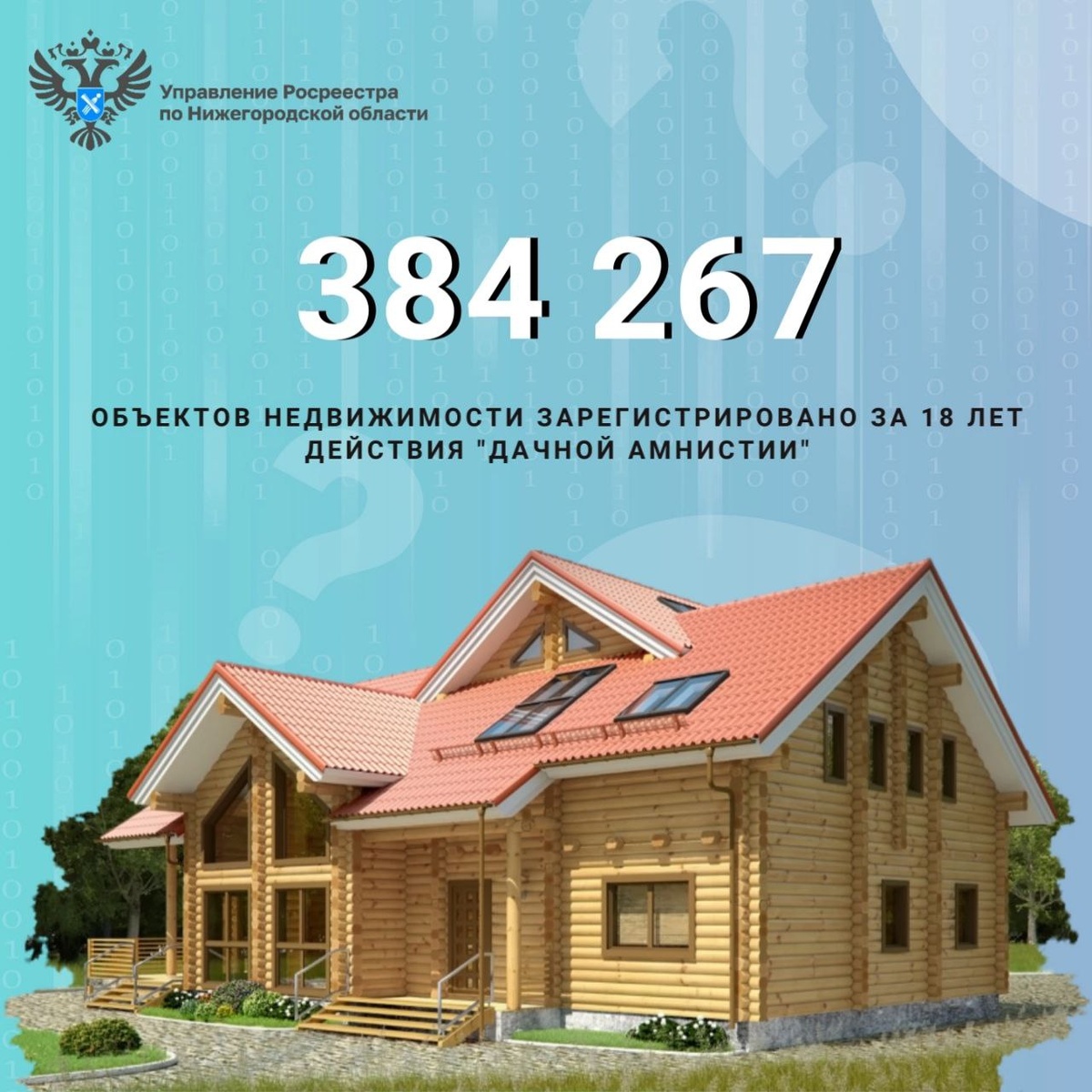 В период с 01.09.2006 до 31.12.2024 в Нижегородской области в рамках «дачной амнистии» были зарегистрированы права на 384 267 объектов недвижимости. #услугиРосреестра #цифрадня