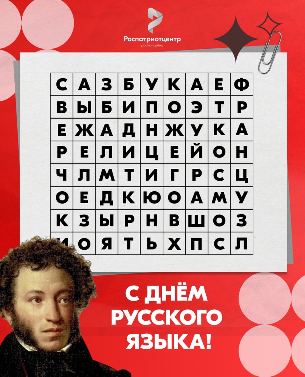 С Днём русского языка! (И не только, как выяснилось в комментариях) Этот международный праздник уже 15 лет отмечают в День рождения Александра Сергеевича Пушкина 🎉 Специально для вас собрали филворд: ищите слова в сетке по вертикали и горизонтали, а мы расскажем, какое отношение они имеют к празднику. Ответы присылайте в комментарии 👇🏻 ❤️ Подписывайтесь на Роспатриот