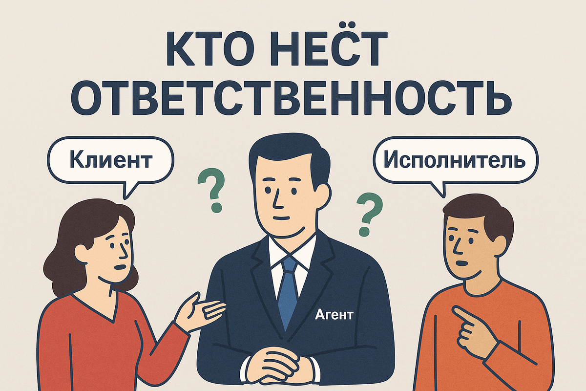 Когда компания работает по агентской модели, возникает важный юридический вопрос: кто отвечает перед клиентом за качество, сроки и результат — вы или исполнитель? Это не просто теоретика — при ошибке исполнителя претензии часто летят в сторону платформы или агента. Разбираемся, как грамотно выстроить ответственность в договоре и на практике. Клиент оплачивает услугу агенту, видит логотип платформы, общается с менеджером — и считает, что именно компания отвечает за результат. Но по факту услугу оказывает не компания, а исполнитель (фрилансер, самозанятый и т.д.). Если не прописать это в документах — клиент может законно требовать всё с вас. По ГК РФ (ст. 1005, 1006, 1007): Если вы не указали, что вы — агент, или приняли деньги от имени себя: Работа по агентской модели — это не только про деньги и договоры. Это ещё и про распределение ответственности.