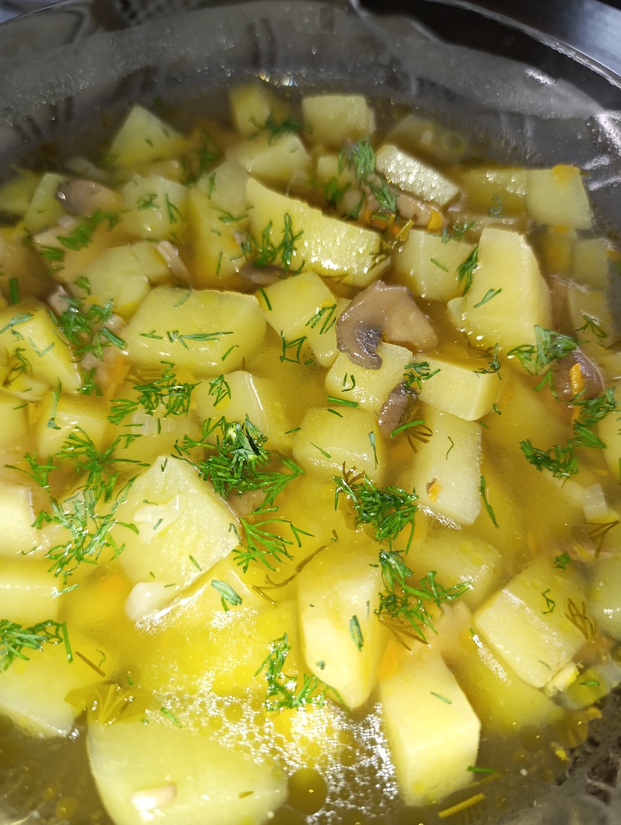 Вкусный, ароматный супчик, в данном случае он с шампиньонами. У каждого есть секрет его приготовления. Мне хочется поделиться свои секретом. Супчик готовлю только с картошкой, без каких либо круп. Да и добавляю все как у всех (лук, морковь и немного чесночка и специй). Для этого супа я готовлю пассировку ..... с грибами, то есть грибы, перед добавление в кастрюлю я пассирую. Лук нарезаем, морковь натираем и на сковороду на небольшой огонь. Как только лучок стал прозрачным (не зажариваем!!!!!!), добавляем грибы и пассируем все вместе - даем раскрыться грибному вкусу. Готовлю так с замороженными грибами. Если грибы свежие - то их я предварительно отвариваю как только насобирали и перебрали в 2-3 водах (но это отдельная история). Пока картофель вариться в кастрюле, на сковороде готовится пассировка. Затем все соединяем и добавляем Ваши специи по вкусу. Приятного аппетита!!!!