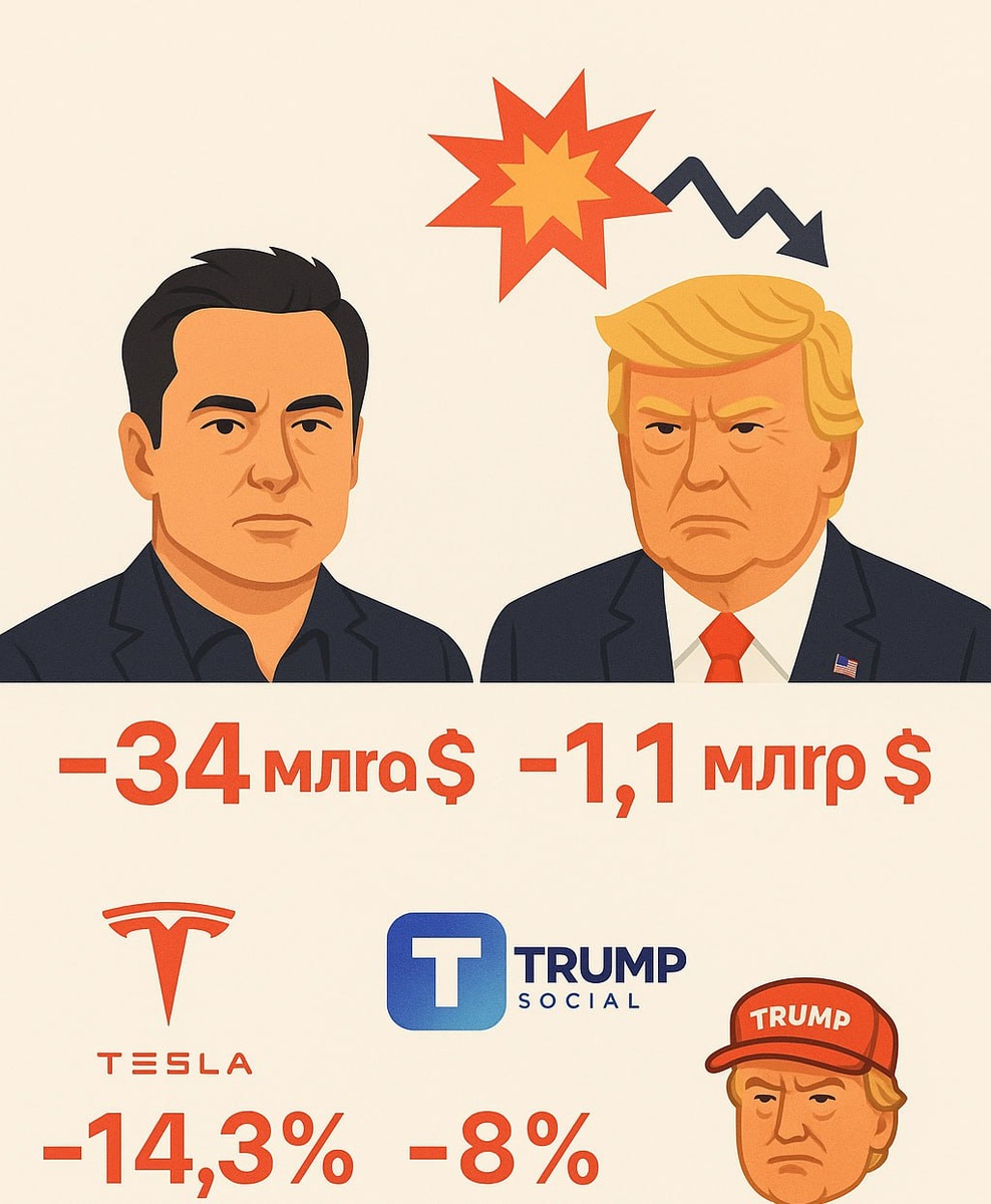 Трамп и Маск потеряли миллиарды из-за конфликта 💥📉 Илон Маск и Дональд Трамп понесли колоссальные убытки на фоне недавнего конфликта. 💸 Илон Маск потерял $34 млрд за сутки — его состояние теперь оценивается в $334,5 млрд. Несмотря на это, он остаётся самым богатым человеком в мире. 💸 Дональд Трамп лишился $1,1 млрд. 📉 Что произошло: 🔻 Tesla упала на 14,3% — убыток Маска составил $20 млрд; 🔻 Trump Media потеряла 8% — Трамп недосчитался ~$200 млн; 🔻 Мемкоин TRUMP просел на 10% — ещё ~$900 млн минус у Трампа. Инвесторы негативно отреагировали на эскалацию напряжённости, и рынок отразил это незамедлительно.