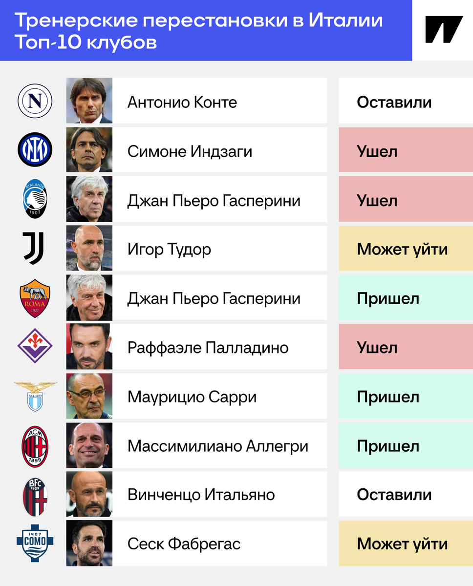 Только «Наполи» и «Болонья» – точно без ротации. Что-то невероятное в Италии: вся первая десятка может сменить тренеров. Оцените. В тренерский микс почти влез Антонио Конте, но все-таки остался в «Наполи» после разговора с президентом Аурелио Де Лаунтерисом. А вот у остальных ожидаются срочные перестановки. «Интер» и «Аталанта» ищут тренера. «Юве» уже согласен на Тудора Пока только инсайды. ❌ «Интер» в поиске, ведь Симоне Индзаги уехал в «Аль-Хилаль», получилось неожиданно. На смену долго сватали Роберто Де Дзерби из «Марселя» или Сеска Фабрегаса из «Комо», сейчас пишут про Кристиана Киву из «Пармы». ❌ «Аталанта» тоже ищет вариант: все же рассталась с Джан Пьеро Гасперини, который ушел в «Рому». Стефано Пиоли – один из главных кандидатов. Говорят также про Тиаго Мотту, пока интрига. Был вариант с Раффаэле Палладино. ❌ «Фиорентина» без тренера: решили не продолжать сотрудничество с Раффаэле Палладино и искать нового, что странно, ведь продлились на год еще в мае. Кто вместо – непонятно,