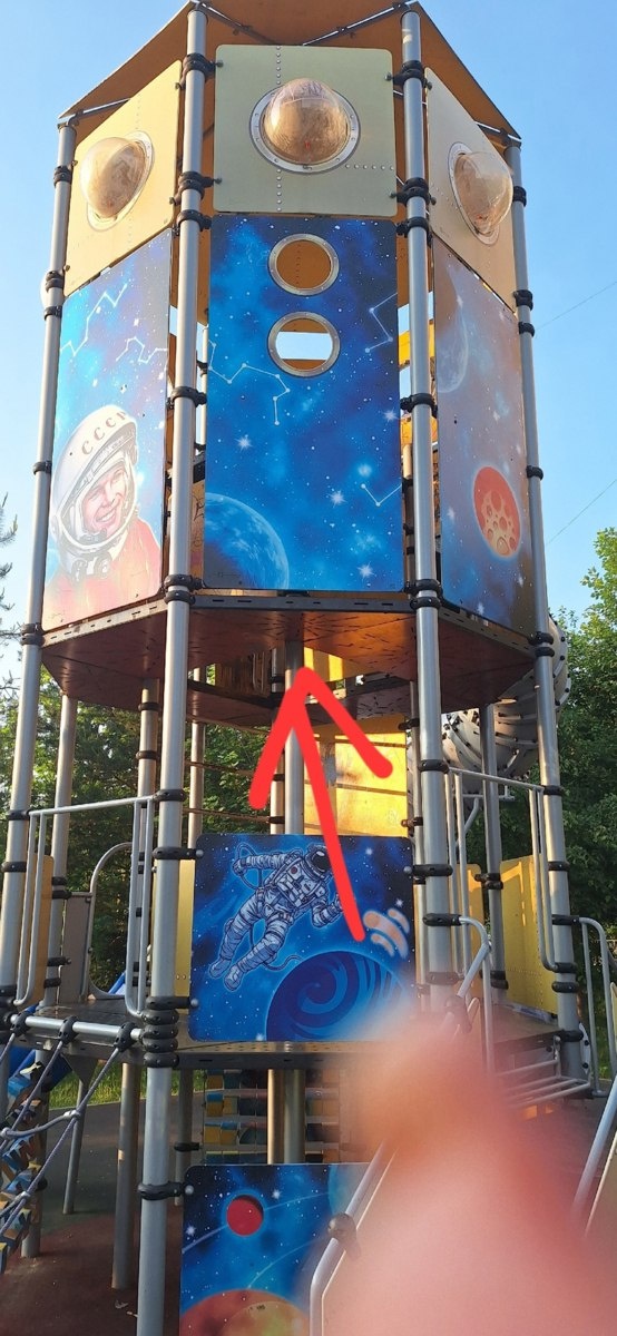 В сквере Гагарина на высокой горке одно из ограждений со сломанным крепленийем наклоняется когда дети на него облакачиваются, да и без нагрузки видно, что оно не ровно держится.