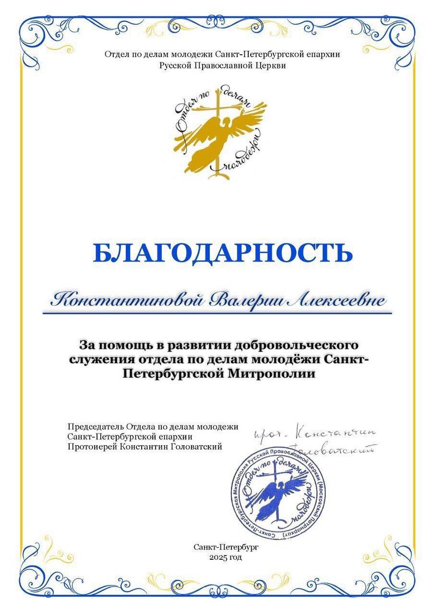 💥Студентка ГИКИТ отмечена благодарностью Санкт-Петербургской епархии за волонтерскую деятельность