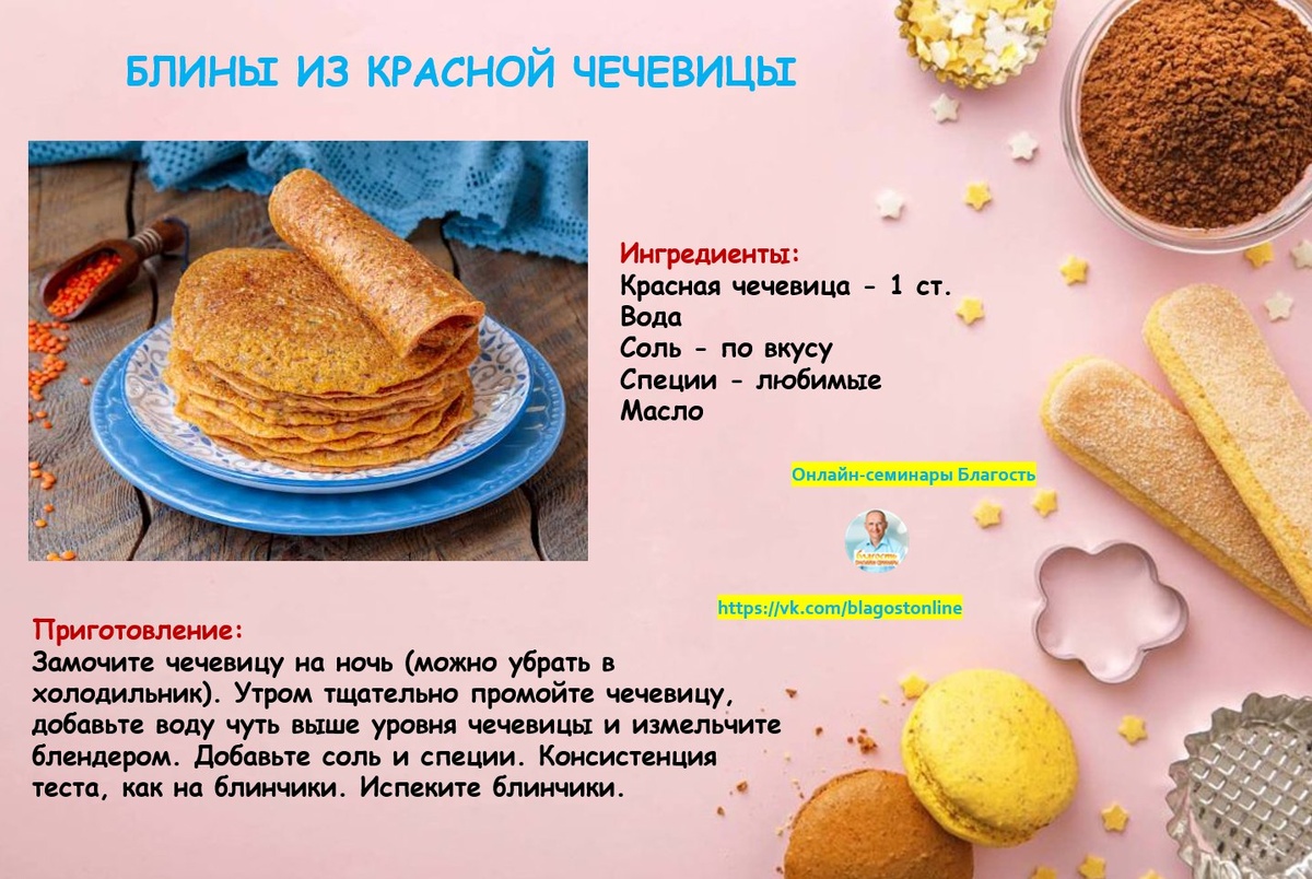 🥞 БЛИНЫ ИЗ КРАСНОЙ ЧЕЧЕВИЦЫ ⠀ 🌀 Ингредиенты: Красная чечевица - 1 ст. Вода Соль - по вкусу Специи - любимые Масло 🌀 Приготовление: Замочите чечевицу на ночь (можно убрать в холодильник). Утром тщательно промойте чечевицу, добавьте воду чуть выше уровня чечевицы и измельчите блендером. Добавьте соль и специи. Консистенция теста, как на блинчики. Испеките блинчики.