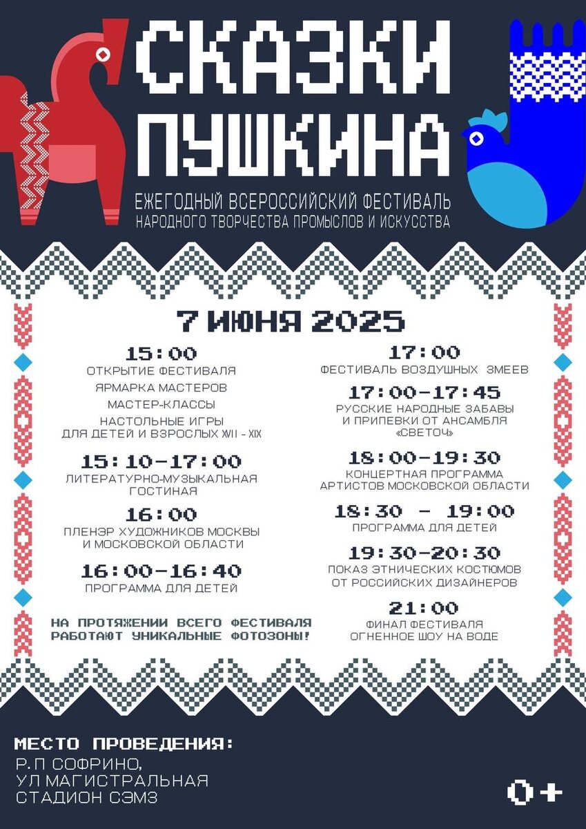 ✨Завтра, 7 июня, на стадионе СЭМЗ в Софрино состоится ежегодный всероссийский фестиваль народного творчества, промыслов и искусства! В ПРОГРАММЕ: - Большая ярмарка мастеров и мастер-классы; - Фестиваль прикладного творчества; - Фестиваль воздушных змеев; - Литературно- музыкальная гостиная; - Программа для детей; - Настольные игры для взрослых; - Пленэр художников Московской области; - Дефиле этнических костюмов от российских дизайнеров; - Концертная программа от лучших солистов Московской области. 🔥ФИНАЛ - ОГНЕННОЕ ШОУ НА ВОДЕ🔥 Принять участие в фестивале прикладного творчества и фестивале воздушных змеев можно по предварительной записи.