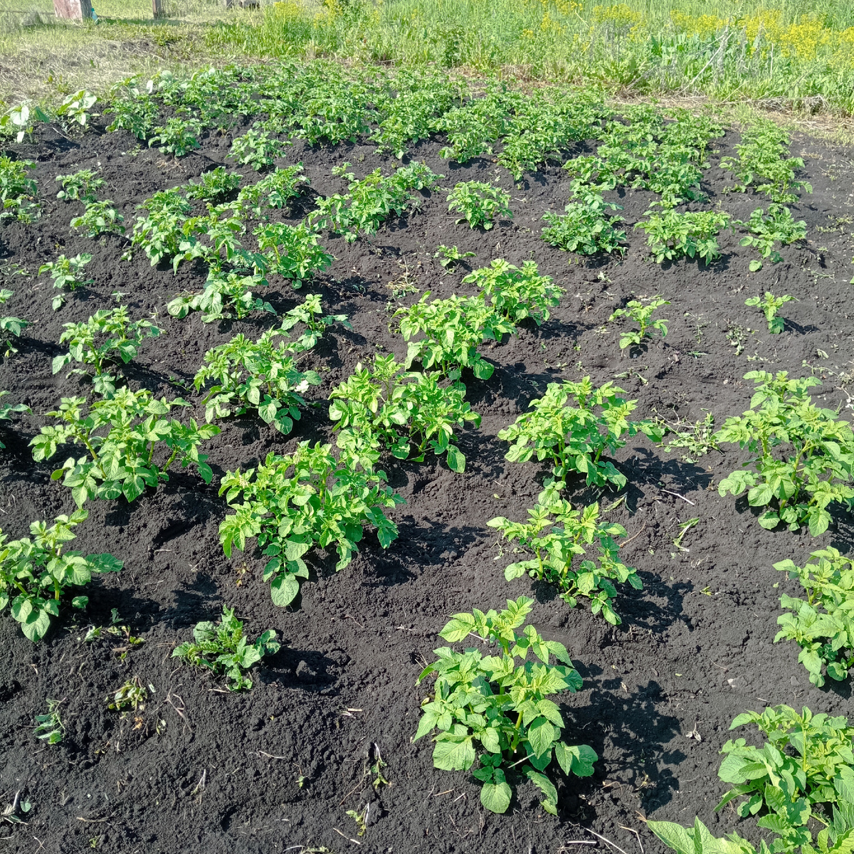 Почему так долго я окучивала, спросите? Да потому что поле-то не паханое и не копаное. Земля очень хорошая, но мне было не до перекопки, а муж вообще к этому относится поверхностно. Правда, увидел, как мы с ним лихо посадили скороспелую картошку, которую я купила в магазине, что даже решил не выкидывать картошку, которая вянет у нас дома. Отложил её для посадки. Она хоть и вялая, но с хорошими ростками. Вот её я и окучивала одна.