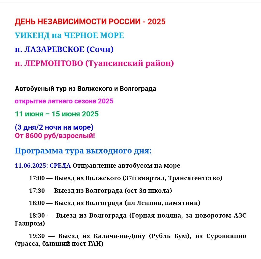 В стоимость входит: +Проезд комфортабельным автобусом/микроавтобусом в оба конца из Волжского и Волгограда +Проживание 3 дня/2 ночи в номерах с удобствами рядом с морем +Страховка перевозчика в пути по ОСГОП +Сопровождение в пути. Стоимость тура ниже 👇👇